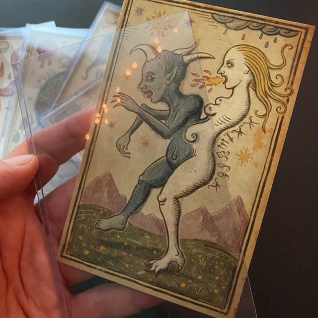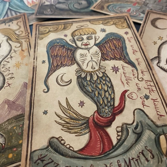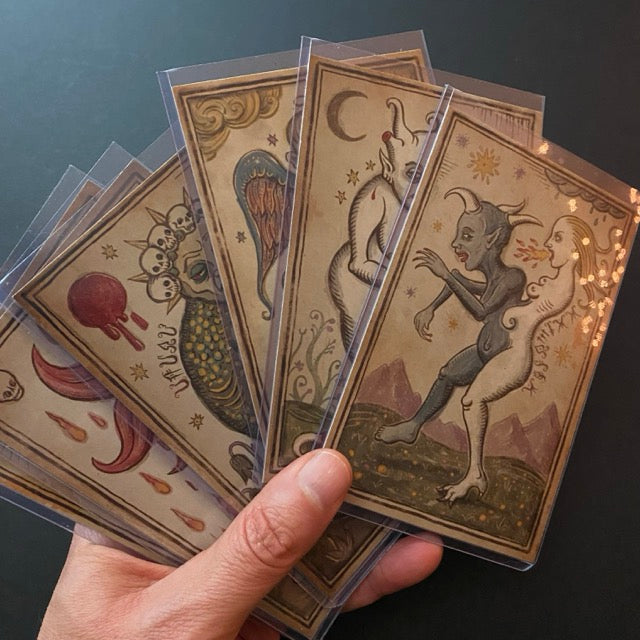 Printed on heavy archival cotton paper (5 × 3.5 in.), every card is signed and numbered on the back and marked with a unique hand-drawn doodle.